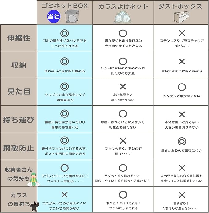 【使用素材は強度抜群】 ゴミ出しは毎週、種類によっては毎日のように外に出して使用するゴミネットボックスになります。 長くご使用いただく為にも、シート部分にはPUレザーを使用。 PUレザーは伸縮性と撥水性に優れており、何度折り畳みしても畳みシワがつきにくく、雨の日でも 安心して継続的にご使用いただけます。 また、網に使用しているPVC素材は擦れに強く、傷がつきにく商品を長く愛用いただけます。