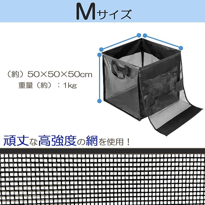 商品内容:ゴミネットBOX1個 、固定用フック1個。サイズ(約):縦50cm/横50cm 重量:1kg 色 : 黒 原産国 :中国。素材:持ち手:ナイロン100% シート:PUレザー 網:PVC。
