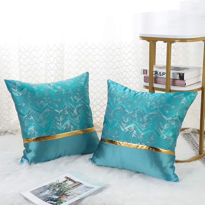 YunJeude クッションカバー 45 45 北欧 2枚セット おしゃれ 可愛い 柔らかい 豪華 モダン 柄 シンプル ファスナー 装飾ゴールド合皮 インテリア 部屋飾り (ターコイズ, 45 45)
