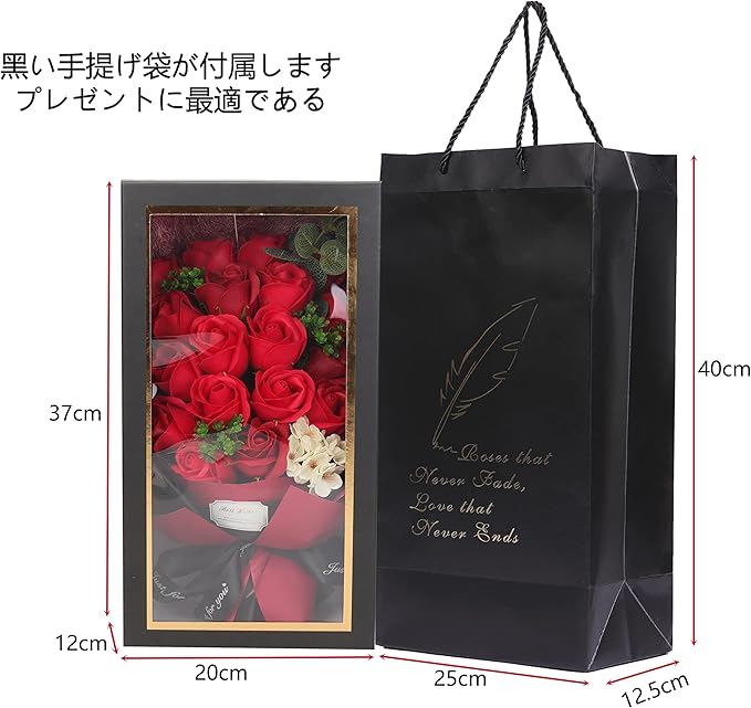【黑い手提げ袋が付属します】ギフトBOX入りソープフラワーには、18本のアーティフィシャルローズが、花束サイズ:約32 16 9cm、総重量:約450g。高級感のある透明な金枠のデコレーションボックスサイズ:約37*20*12cm。 また、すぐにお渡しできるよう専用のギフトボックスをお付届け致します。ギフトとしての見栄えもばっちり,黒い手提げ袋サイズサイズ:約40*12.5*21cm,ギフトをより高級で貴重なものに見せてくれるため、どなたかへのプレゼントにも最適である。