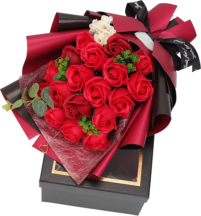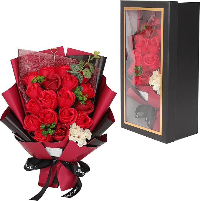 woowei ソープフラワー 花束 母の日 敬老の日 枯れない花 フラワーギフト 人気 造花ブーケ バラ 18本 誕生日プレゼント 女性 バレンタインデー 結婚祝い 退職 送別 贈り物ボックス 黑い手提げ袋が付属します(レッド)