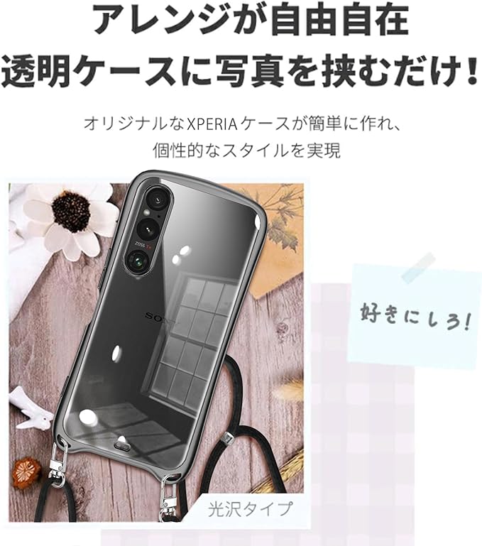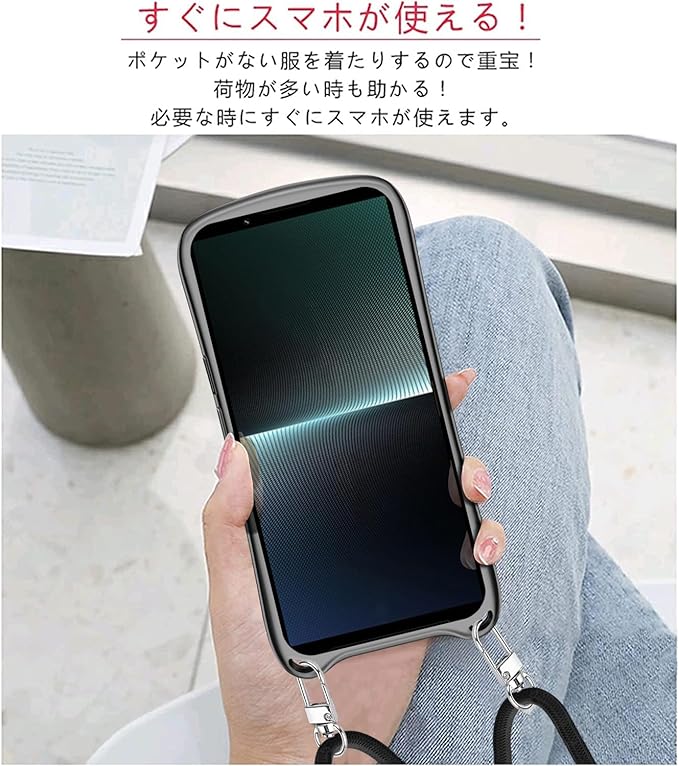 Xperia 1 V ケース ショルダー クリア xperia1v SO-51D SOG10 スマホケース カバー 耐衝撃 肩掛け 首掛け 斜めかけケース 可愛い かわいい 韓国 透明 TPU 長さ調整可能 取り外し可能(ブラック)