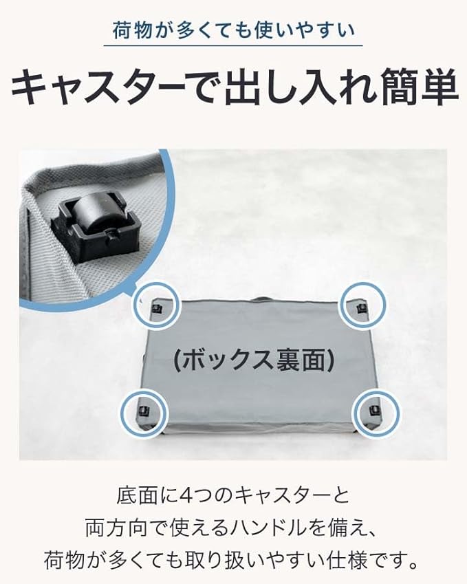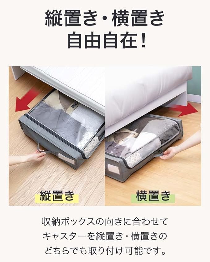 ✅【キャスターで出し入れ簡単】底面に4つのキャスターと両方向で使えるハンドルを備え、 荷物が多くても取り扱いやすい仕様です。✅【縦置き・横置き自由自在!】収納ボックスの向きに合わせてキャスターを縦置き・横置きのどちらでも取り付け可能です。✅【両方向から開け閉めできるダブルファスナー】カバーは両方向から簡単に開け閉め可能。一気に中身を整頓したい時に、ガバッと大きく開けられて便利です。
