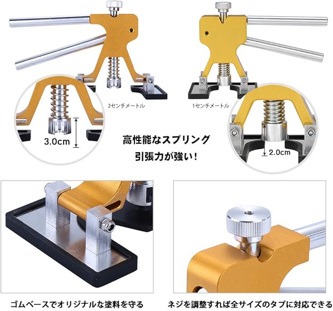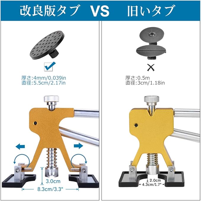 メリット:①改良版デントリフターの可動足の設計、小さ凹み大き凹みを簡単に補修が出来ます。様々な凹みに対応いたします。②タブは新しい素材で作られるので、もっと耐久性があり、強い靭性、凹みにぴったりフィット、循環使用でできます。③パテを使わない、再塗装もしないので、オリジナルの塗装を守ります、環境にとっても良いです。