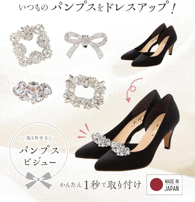いつものパンプスに付けて華やかな雰囲気を演出。 パーティや結婚式などに、新しい靴を用意しなくても このアクセサリーがあればワンタッチで簡単にドレスアップできます。