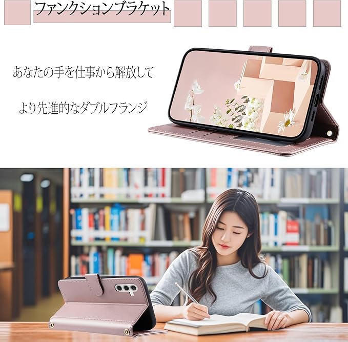 カード収納:スマホケース galaxy s25 ショルダー の内部には3つのカードスロットと1つの空きポケットがあり、交通系カード、日常的に使う銀行カード、写真なども簡単に収納できます。前面はマグネットボタンでしっかりと閉じられるため、財布としても活用可能です。これにより、スマホだけを持って外出して買い物ができるようになります。さらに、galaxy s25 ケース カード収納 は映画鑑賞やビデオ通話の際にスタンドとして折りたたむことができ、お好みの角度で動画視聴や読書などを楽しむことができます