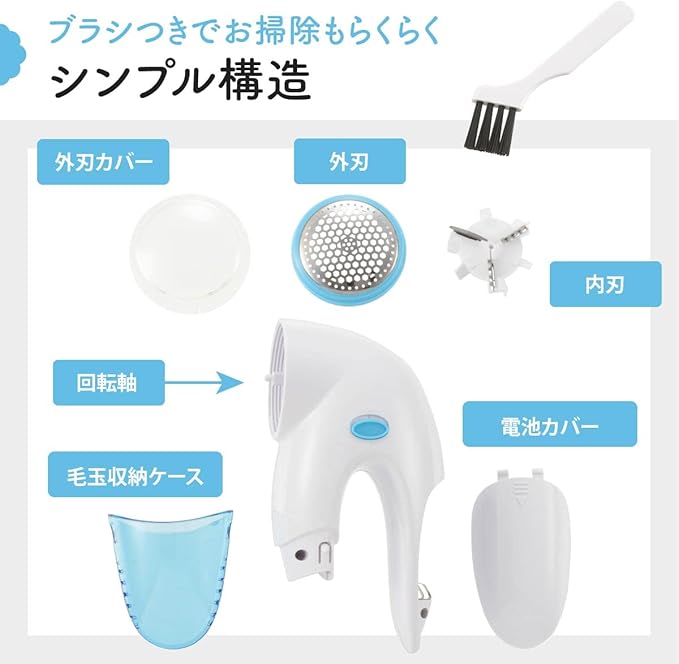 ●しっかり握れるスリムグリップ ●余裕ある約42mm外刃で一度にたくさん毛玉が取れます ●安全スイッチ付きで外刃を外した状態のときは電源が入りません ●保管時も安心、外刃カバー付き ●着脱式でお手入れ簡単な毛玉収納ケース ●単3乾電池2本使用(電池別売)