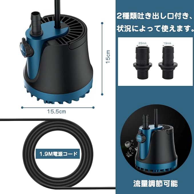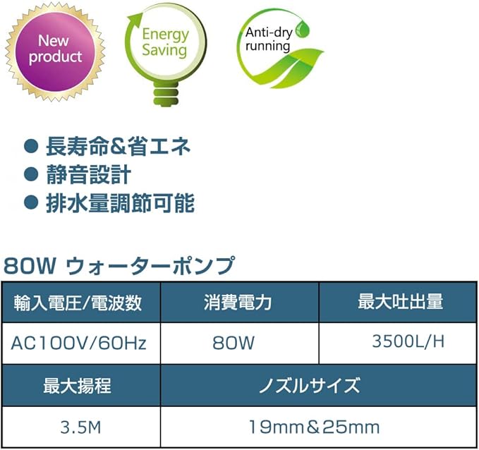 【規格】☆入力電圧:AC 100V/60Hz ☆電力:80W ☆最大揚程:3.5Mぐらい ☆吐き出し口外径:19mm&25mm ☆最大流量:3500L/H ☆騒音クラス:40デシベル以下 ☆電源コードの長さ:1.9M