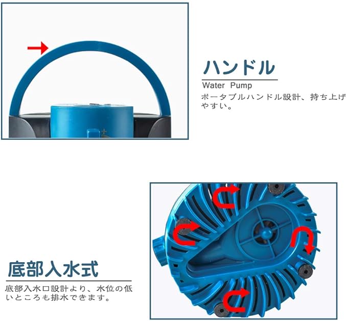 【排水量調節可能】側部には回転盤があって、流量が調整できます。流量の調整を通して、揚程の高さも調整できます。