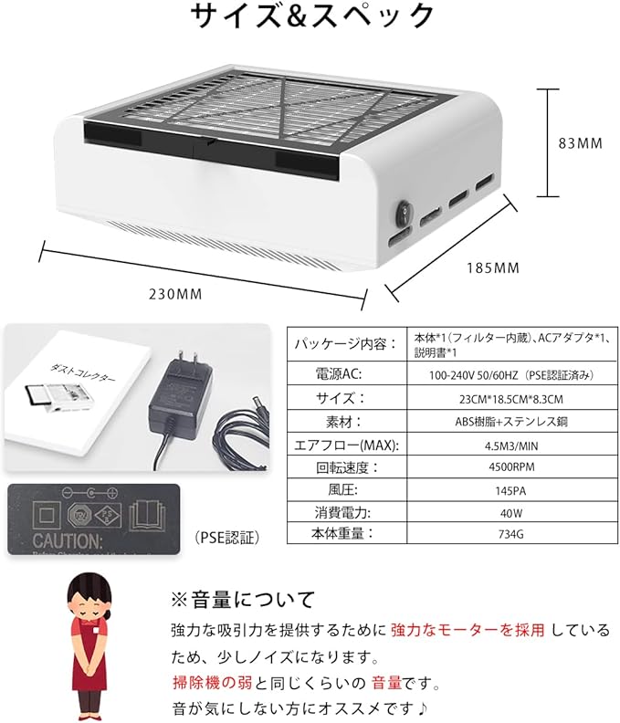 【適用場合&アフターサービス】ネイルファイル、ネイルマニキュア、ネイルエクステンション、UVジェルネイル、クリスタルネイルなど、さまざまな埃の多いネイルアートケア処置に適用できます。家庭やマニキュア用、サロンにもお使い頂けます。【サービス保証】万が一、お届けした商品に瑕疵・故障があった場合、ぜひこちらにメールでご連絡してください。サポート担当者は必ず24時間以内に丁寧にご対応させていただきます。是非こちらにお問い合わせください、しっかり対応しております。