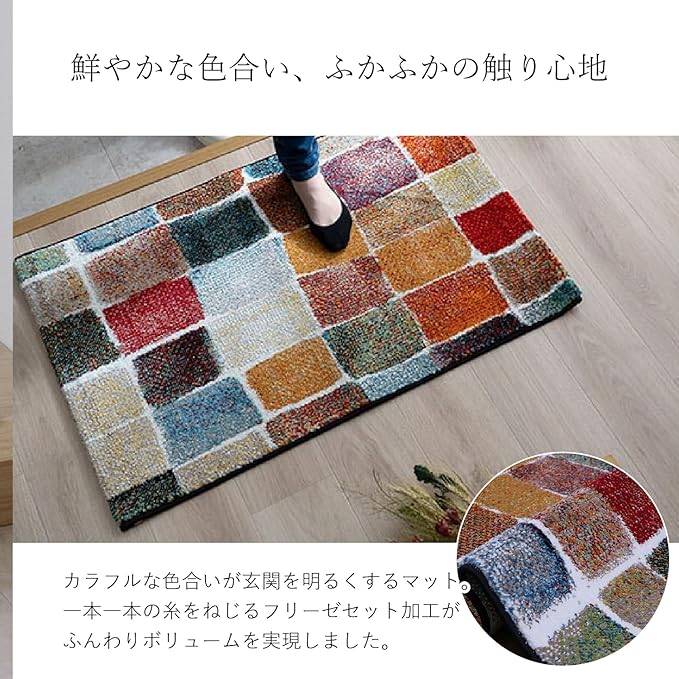 ウィルトン織りの玄関マットです。ラグでも人気の柄です。ウィルトン織りは非常に耐久性の高い織物です。家の中でも靴を履いて生活するヨーロッパで、土足で扱うことを前提として作られておりますので、長時間踏みつけてもヘタリにくく、弾力性もあり長くご使用頂けます。本商品の『繊維の密度を表すノット数』は112,000ノットです。本商品のパイル部分にはポリプロピレン素材を使用しております。ポリプロピレンはヘタリにくく、耐久性に優れ、繊維の中でも軽い素材です。また、汚れが付着しにくく、遊び毛や毛玉が非常に出にくいという特徴もあります。玄関のワンポイントとして、ご使用していただきますと華やかになり高級感がでます。抗菌・防臭、消臭機能がついていますので、臭いが気になる玄関でも安心してお使いいただけると思います。