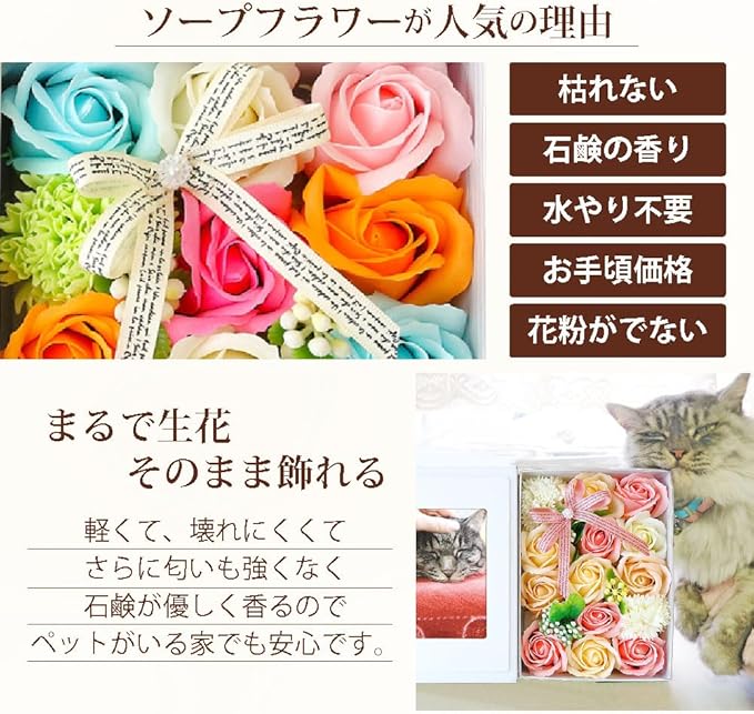 【枯れないお花】ソープフラワーとは石鹸と同じ原料を使用した造花です。ほのかな優しい香りに癒され、成果と違い水やり等のお手入れ不要で、半永久的に美しい状態を楽しめます。