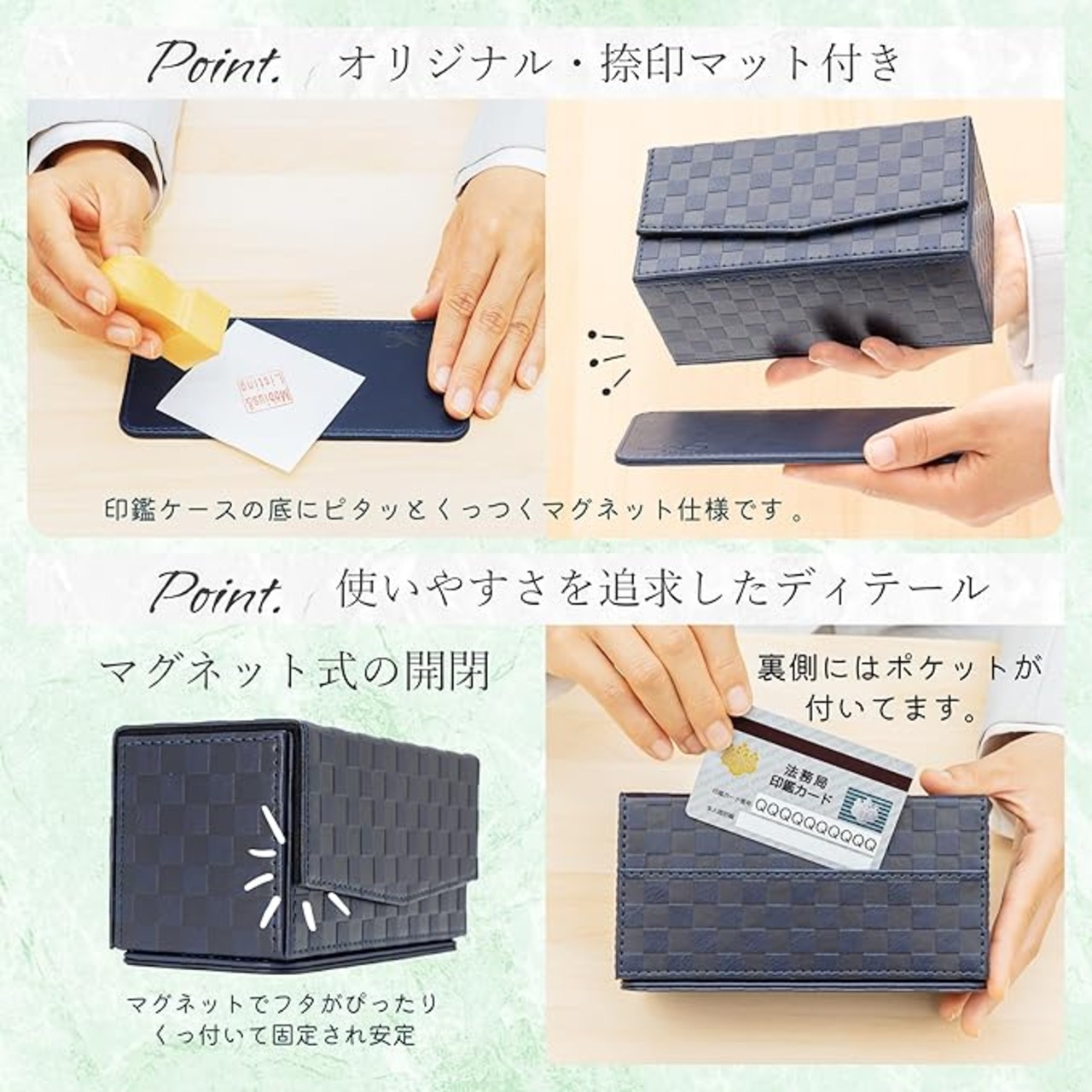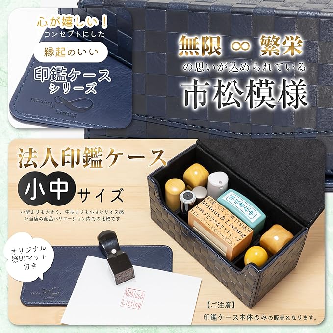 M bius 【市松模様で縁起のいい・法人 印鑑ケース シリーズ・小中型サイズ】 ハンコケース ゴム印ケース 印箱 判子ケース 法人用 会社 印鑑 ケース 法人 (実印 銀行印 角印 認印 住所印 など) 4本 ゴム印 朱肉 スタンプ台 捺印マット付き №11 (Navy)