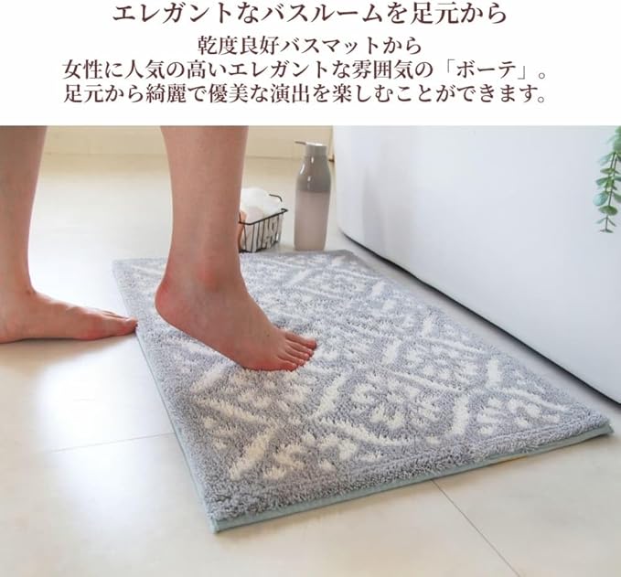 乾度良好バスマットシリーズから女性に人気の高いエレガントな雰囲気の「ボーテ」が誕生。 足元から華麗で優美な演出を楽しむことができます。 乾度良好バスマットの繊維は、特別な加工を施した繊維を使用。繊維には無数の穴があいているのでこの穴にすばやく水分が吸収されます。 だから足を乗せた瞬間に水分を吸収、濡れた感覚がほとんどありません。 乾度良好シリーズは無数の穴から水分だけではなく空気も取り込みすばやく拡散、あのイヤなヒンヤリ感がありません。