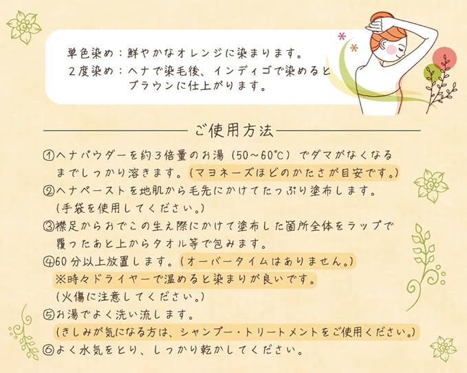 ●Aランクオーガニックヘナの天然植物染料です。40~60分程度の時間でヘナ特有の綺麗なオレンジ色に発色します