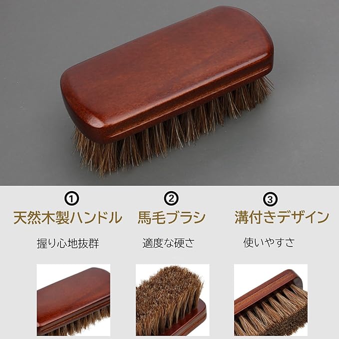 KOME 靴ブラシ シューケア ブラシ 革靴用 ハンディーホース シューケア ホコリ落とし 馬毛製 靴磨き・レザーケア 靴磨きクロス付き