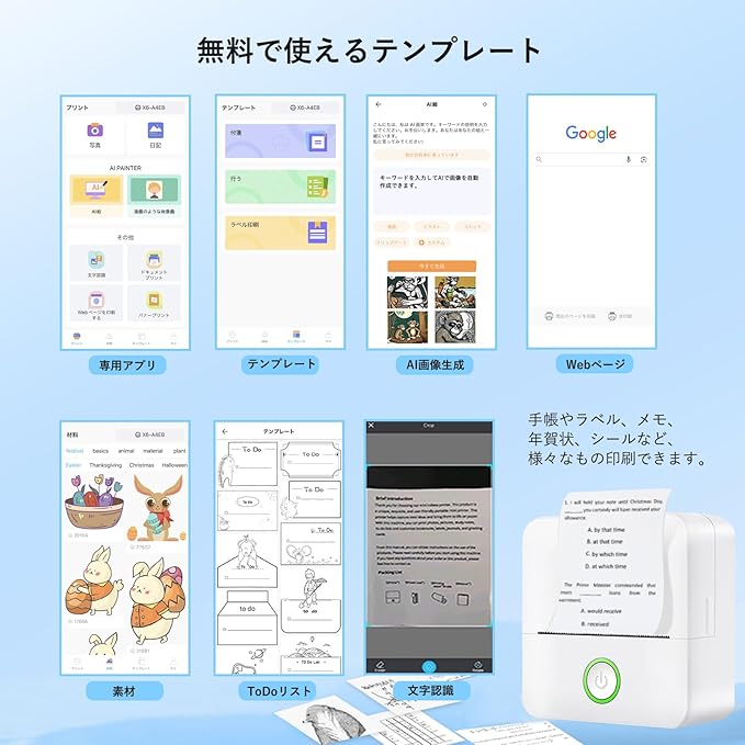 【画像生成AI&スキャン機能&豊富なテンプレート】 画像生成AIのサービスがあり、テキストで出来上がりのイメージを指示するだけで自動的に画像やイラストが生成されるスマホプリンターです。アプリと連携、豊富なデザインテンプレートや素材から、お気に入りのデザインを選んで、やることリストやラベル、メモ、年賀状などを作成し、プリビオでか簡単にプリントできます。専用アプリで、写真や画像にフレームやテキスト等を追加し、そのまま印刷ができます。
