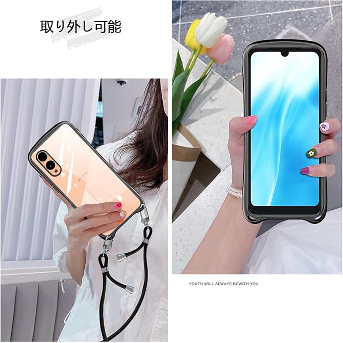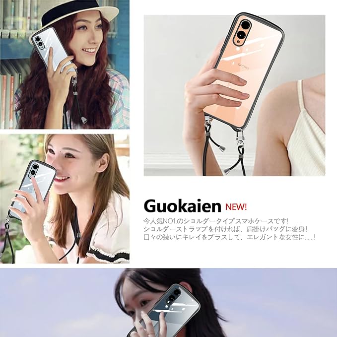 Arrows We2 F-52E ケース ショルダー クリア スマホケース カバー 耐衝撃 透明 TPU ストラップ付き 肩掛け 首掛け 紐付き 斜めがけ 取り外し可能 長さ調整可能(ブラック)