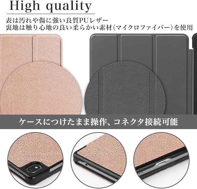 《特徴》さりげなく美しい。しっかり頼もしい このタブレットケース、薄くて軽くていい感じ。スタイリッシュなあなたのタブレットPCにしっかりフィットして、その魅力をいっそう引き立ててくれます。素材は、表に汚れや傷に強い良質なPUレザー、裏には触り心地の良いマイクロファイバーを使い分けています。そしてその開閉はマグネット式だからすごくカンタン。片手でラクラク操作できるし、蓋がお間抜けにパカパカ空いてしまうこともありません。4つの角には本体を衝撃から守ってくれるガードカバーも付いています。カメラ撮影やボタン操作などは閉じたままでも可能なのでストレスもありません。開くと自動で起動して、閉じればスリープモードになるバッテリーにやさしい機能も備えています。カラーバリエーションも豊富なので、シーンに合わせて異なる色を使い分けるのもおしゃれですね。