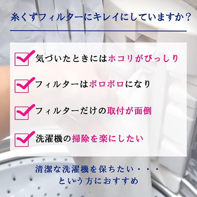 『特徴』 ① 【高品質素材】耐久性のあるマイクロファイバー素材で作られており、長期間の使用にも耐えられます。 ② 【効果的なフィルタリング】 糸くずや髪の毛、ペットの毛などを効果的にキャッチし、洗濯物を清潔に保ちます。 ③ 【洗濯機寿命延長】 フィルターが糸くずやゴミをキャッチすることで、洗濯機のドラムや排水口への負担を軽減し、寿命を延ばします。 ④ 【環境に優しい】繰り返し使用できるため、使い捨てフィルターよりも環境に優しい選択です。