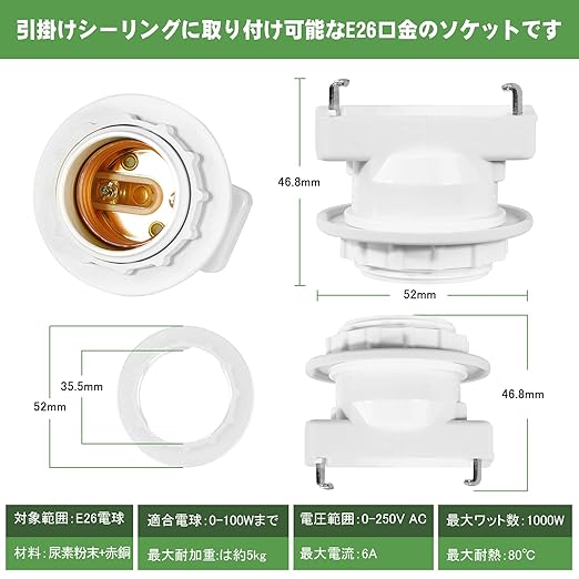 1.E26口金対応角型引掛シーリングアダプター:E26口金の電球であれば、お好みのLED電球、白熱電球をご使用いただけます。