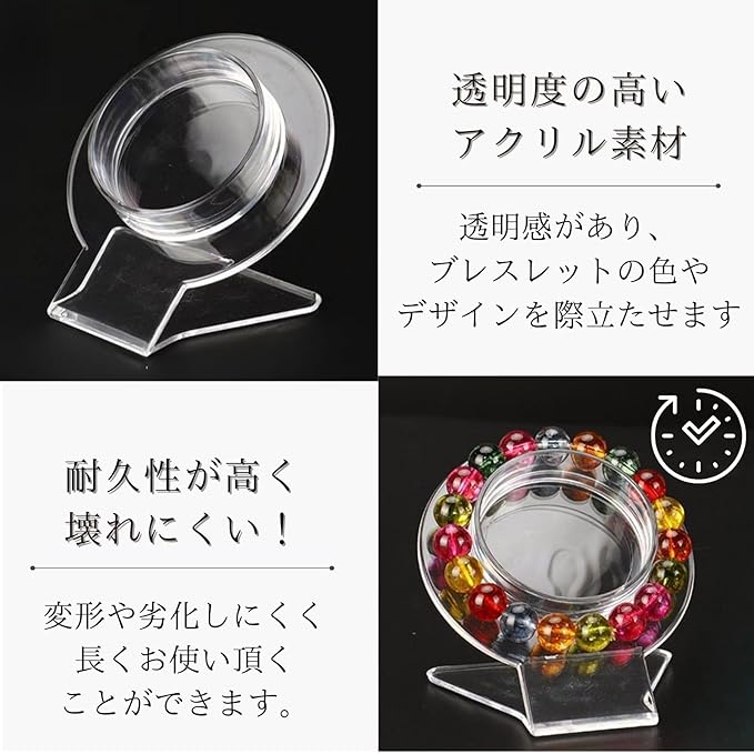 "天然石等のブレスレットのコレクションや展示に便利なアクリル製ディスプレイスタンドです。透明感のあるアクリル素材がブレスレットを美しく展示し、魅せる収納におすすめです。シンプルなデザインでインテリアにも馴染みやすく、シルバーアクセサリーやバングルにもお使い頂けます。 "
