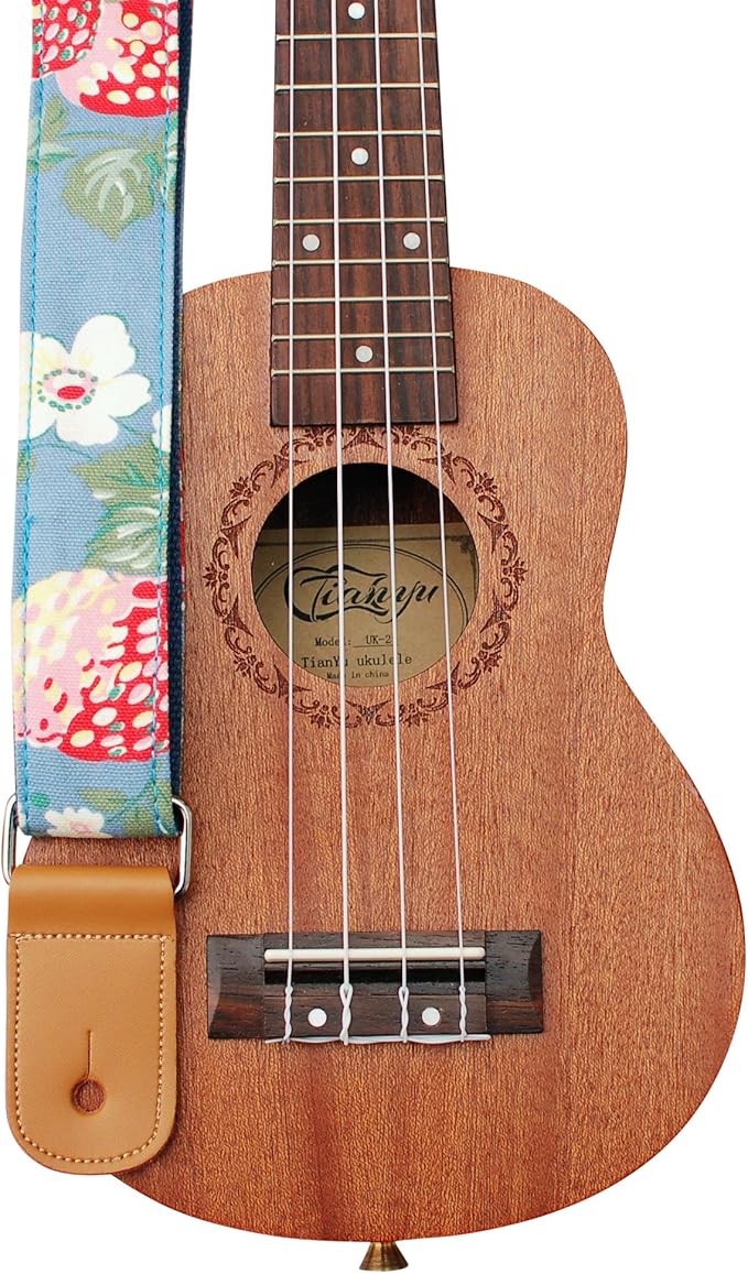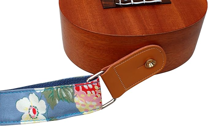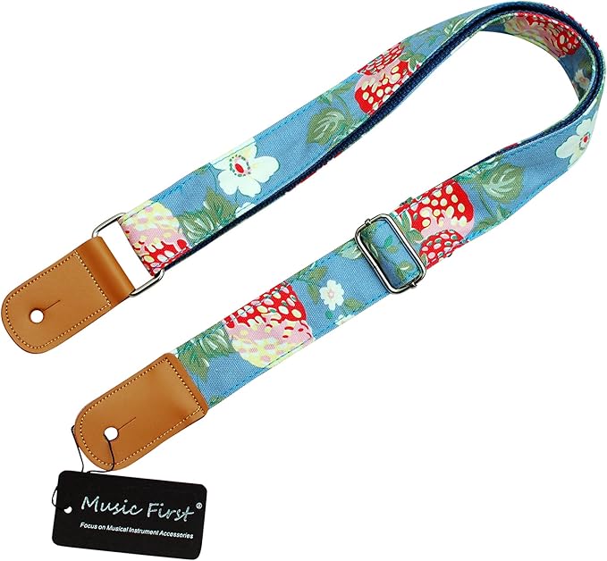 MUSIC FIRSTオリジナルデザインMUSIC FIRST「苺の花」ソフトコットンウクレレストラップウクレレショルダーストラップ / ビンテージスタイルライトブルーイチゴの花の模様。 / 素材:コットン(外側)+本革+コットン(内側)+ 金属部品 / 幅:1.5インチ(3.8センチメートル), 長さ:48inch〜27.5inch調整可能(70〜122センチメートル) / 一つの黄金色のストラップの爪として無料プレゼント