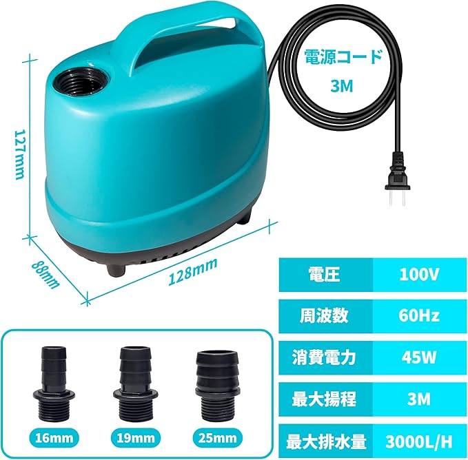 電源コードの長さ:3M 吐出し口径:16mm&19mm&25mm 寸法:128mmX88mmX127mm 重量:0.8Kg