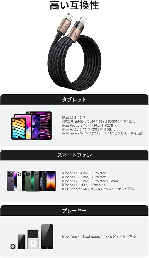 【高い互換性】:本PD 36W急速充電 Type-C to lightningケーブルは、iPhone 14/13~5シリーズ、iPad、iPod、AirPodsなどライトニング端末を対応します。タブレット:iPad 10.2インチ(2021年 第9世代/2020年 第8世代/2019年 第7世代)、iPad Pro 12.9インチ(2017年 第2世代)、iPad Air 10.5インチ(2019年 第3世代)、iPad mini 7.9インチ(2019年 第5世代)などモデルを互換します。スマートフォン:iPhone 14,14 Pro,14 Pro Max、iPhone 13,13 Pro,13 Pro Max、iPhone 12,12 Pro,12 Pro Max,12 mini、iPhone 11,11Pro,11 Pro Max、iPhone XS,XS Max,XR,X,8,7,6,5などモデルを互換します。プレーヤー:iPod Touch、iPod Nano、iPodなどモデルを互換します。
