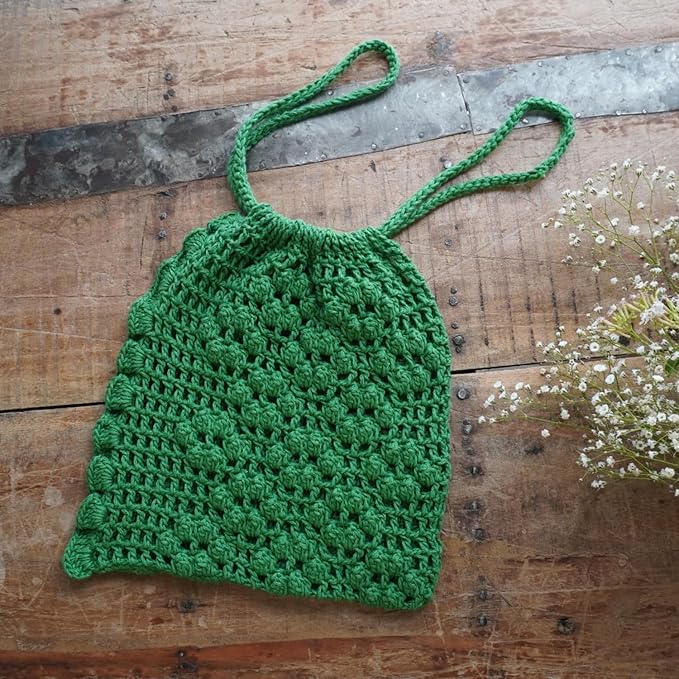 ダルマのリネンラミーコットン並太で編むメッシュ模様の巾着。