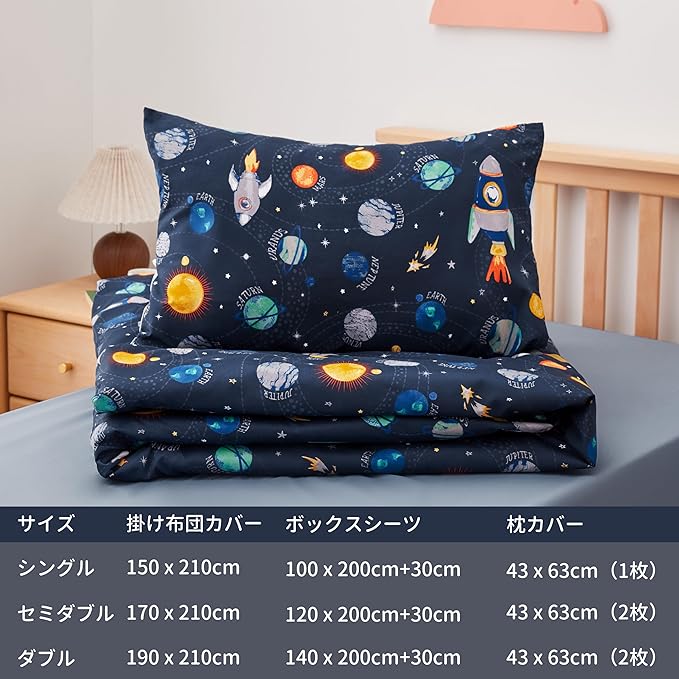 Sunquinn 布団カバー シングル 3点セット 掛け布団カバー 子供用 可愛い 寝具カバーセット ボックスシーツ 枕カバー 速乾 洗える 肌に優しい オールシーズン 丸洗いOK 洋式・和式兼用 洗い替え (シングル・3点セット・宇宙)
