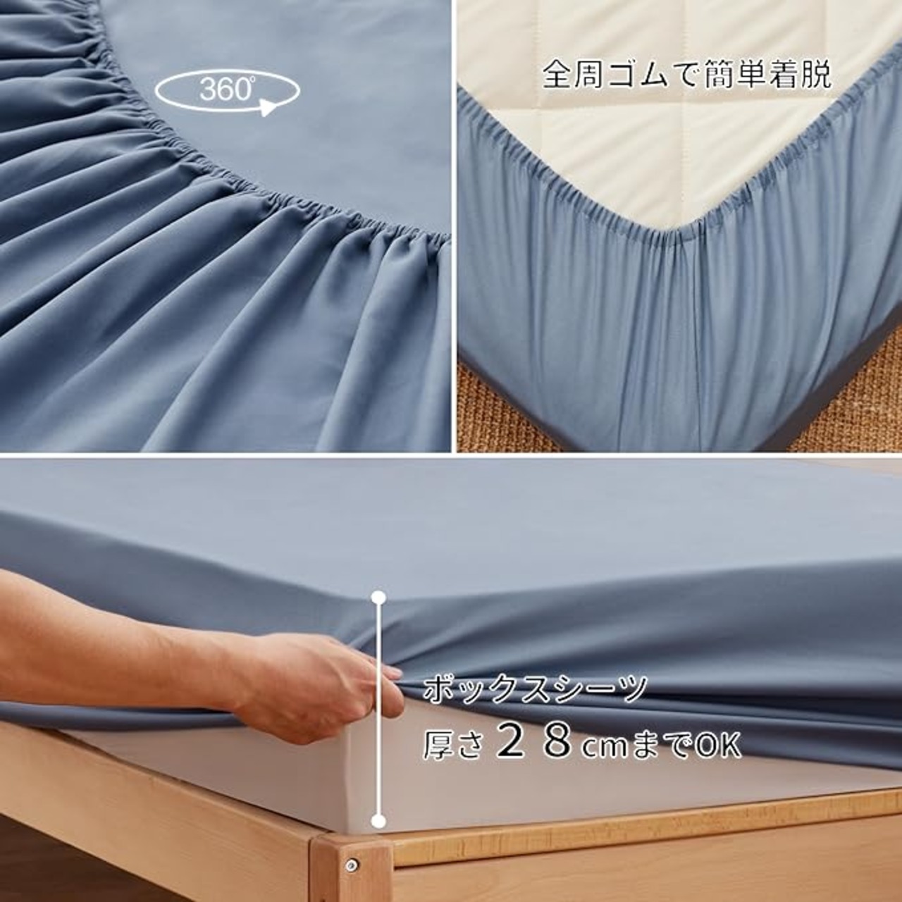 【布団カバーセット内容とサイズ】掛け布団カバー(150 210cm):片側全開ファスナーで出し入れ簡単、内側8ヶ所の布団留めひもでズレを防止。ボックスシーツ(100 200+30cm):全周ゴム仕様で高さ約28cmまでのマットレスにぴったりフィット。枕カバー(43 63cm):封筒型デザインで着脱ラクラク。寝具カバーセットとして、洋式ベッド・和式布団どちらにも対応します。