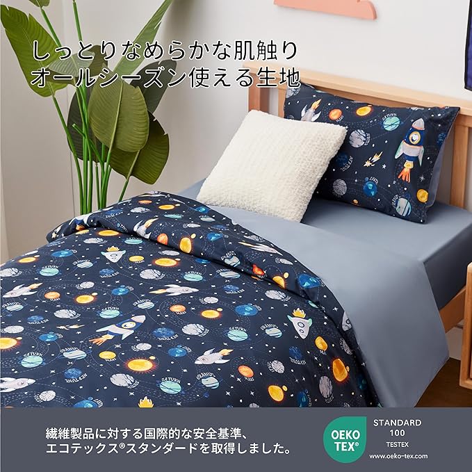 【朝まで快適に眠れる】エコテックス認証の高品質ポリエステル素材を使用。通気性・吸放湿性に優れ、汗をかいてもすぐに湿気を吸収・発散し、肌に優しくサラサラ感をキープ。お子様にも地球にも優しい設計で、オールシーズン快適な眠りをサポートします。