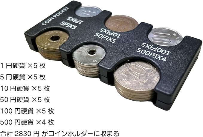 1円玉5枚、5円玉5枚、10円玉5枚、50円玉5枚、100円玉5枚、500円玉4枚、合計2830円の収納力