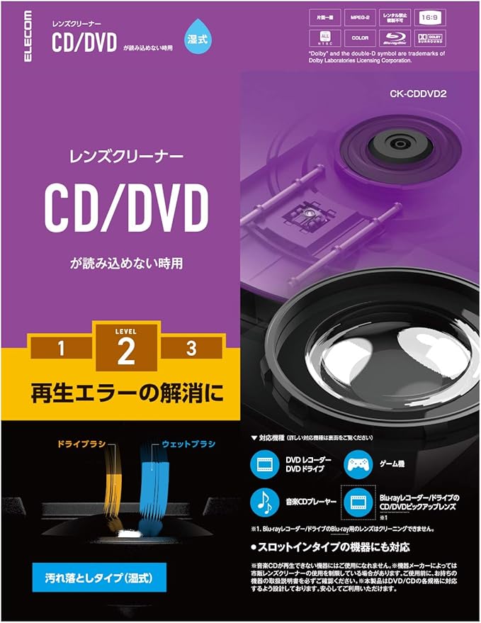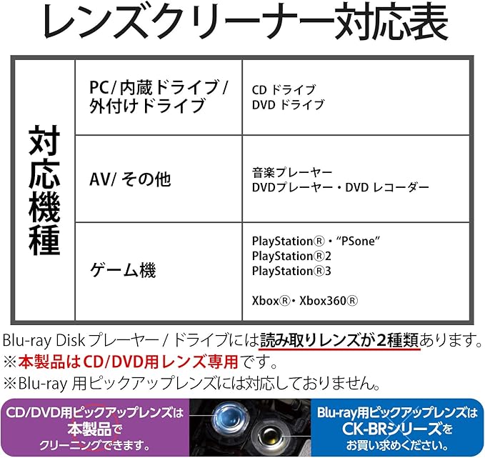 ※ 音楽CDが再生できない機器にはご使用できません。※Blu-ray Discプレーヤー/ドライブには読み取りレンズが2種類あります。本製品はCD/DVD用読み取りレンズ専用です。