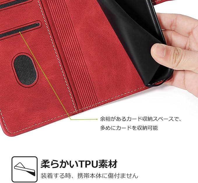 高品質なTPUとPUを利用することで良い手触りと耐衝撃性を実現 ●本体を固定するカバーはTPU素材のソフトケースなので脱着が簡単。ポリカーボネートの固い素材ではないので、脱着時に本体を傷つける心配がなく、落下時にカバーが破損することも無いので安心してご利用いただけます。●レザーのカバーはTPUケースよりも少し大きめに設計されており、どのような落下でも、衝撃が直接スマートフォンに伝わらないので安心です。●外部は上質なPU革素材を採用、傷や汚れが目立ちにくく長く使え、放熱性にも優れています。