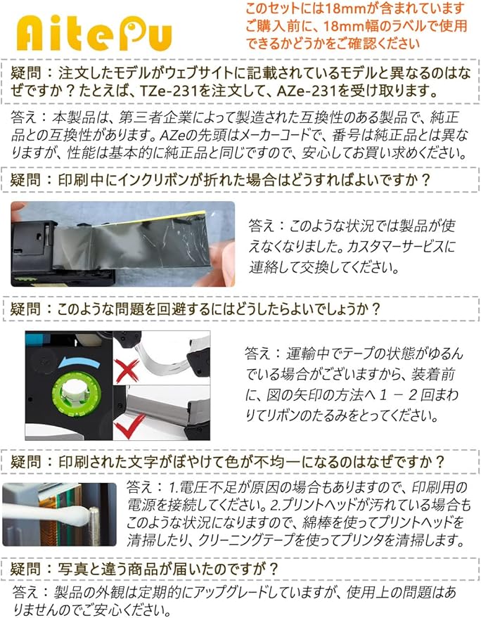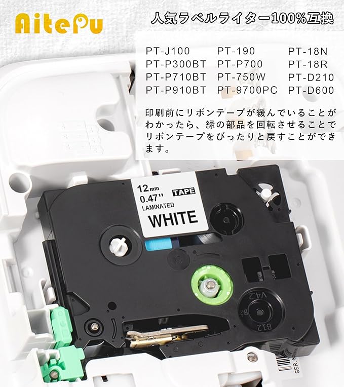 【ラベルライター対応機種】: P-Touch PT-J100W、PT-J100P、PT-J100MB、PT-J100MR、PT-J100SL、PT-J100KW、PT-P300BT、PT-P710BT、PT-P910BT、PT-190P、PT-190S、PT-190MB、PT-190PO、PT-190SL、PT-190KB、PT-12、PT-2730、PT-18R、PT-18N、PT-P700、PT750W、PT-9700PC 、PT-170、PT-160、PT-120、PT-180、PT-250BG、PT-250BY、PT-2500PC、PT-1500PC、PT-PC、PT-240、PT-24、PT-9500PC、PT-9300PC、PT-9200PC、 PT-D210及びその他PTラベルライター機種。