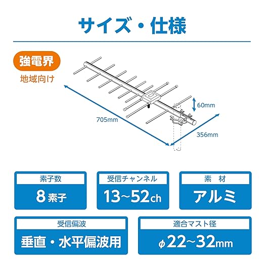 地デジ用の八木式アンテナの定番モデルで、広帯域にわたって高感度で受信できます。