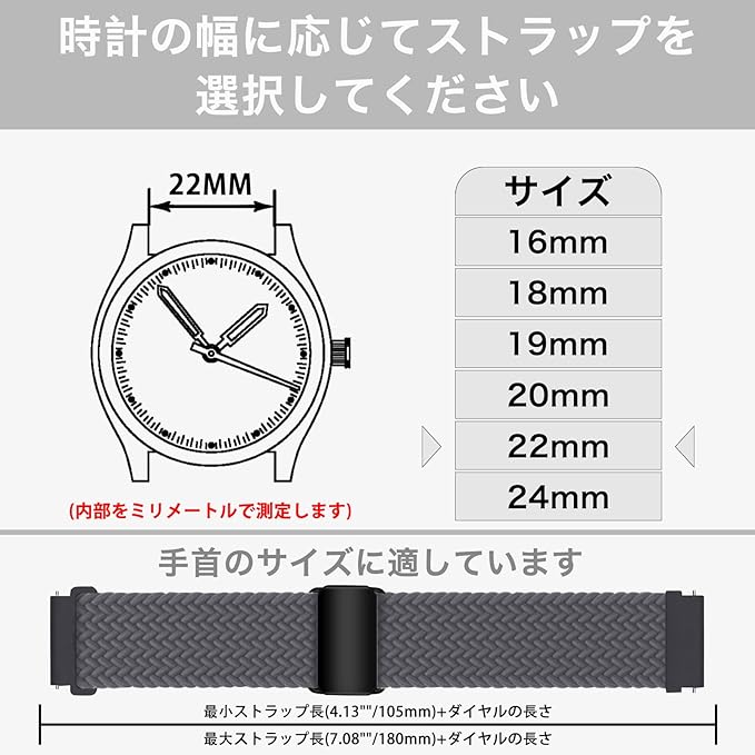 【22mm 対応機種】20mm/22mm 全機種に対応サイズがあります。フィットサイズ:フィット6.3"-9.5" (160mm - 240mm) 手首。長さは無段階で自由に調整可能で、どんな手首でもフィットできます。購入する前に、お手首の周りを測定してください。