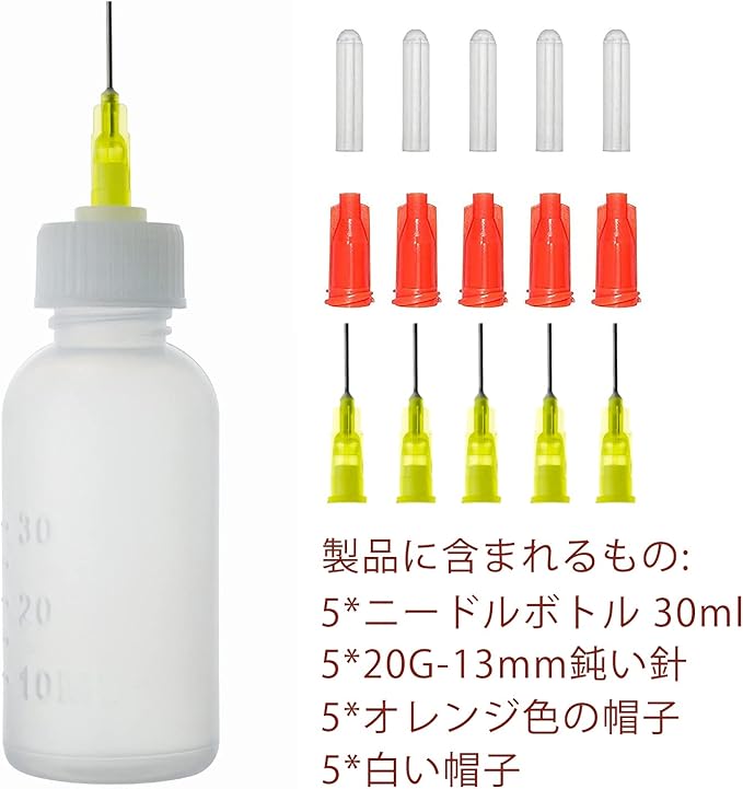 パッケージ内容: ニードルボトル 30ml 5 個、ディスペンシングニードル 20G 0.5 インチ 5 個、オレンジ色の帽子 5 個、白い帽子 5 個。