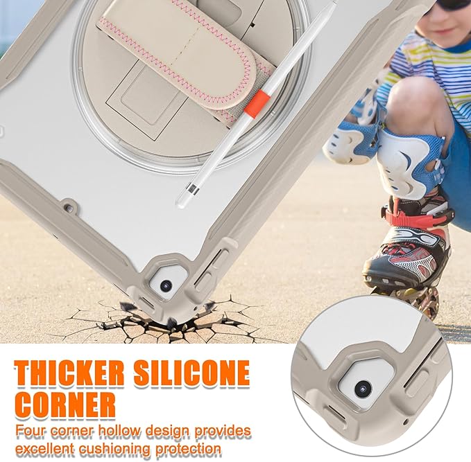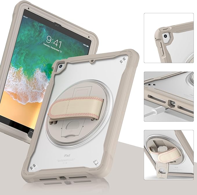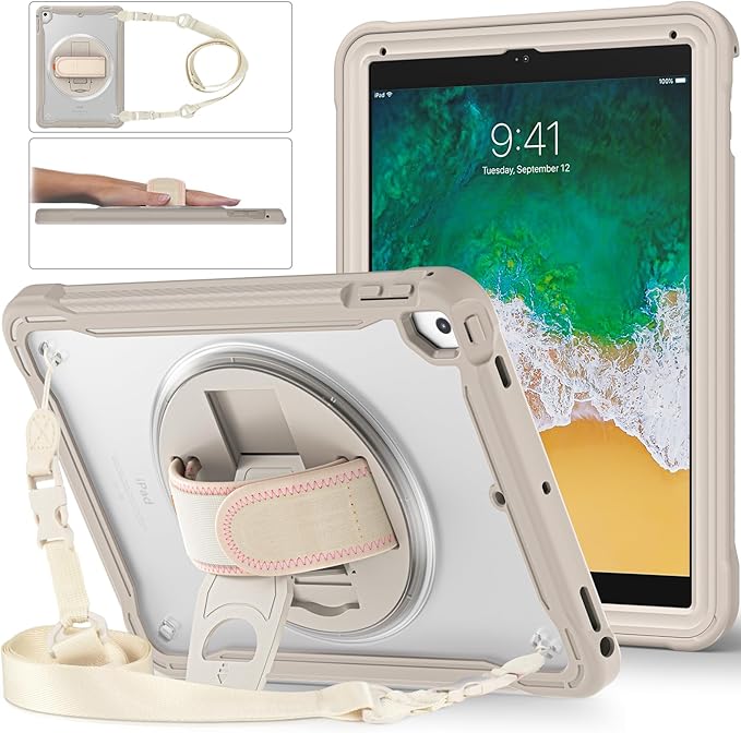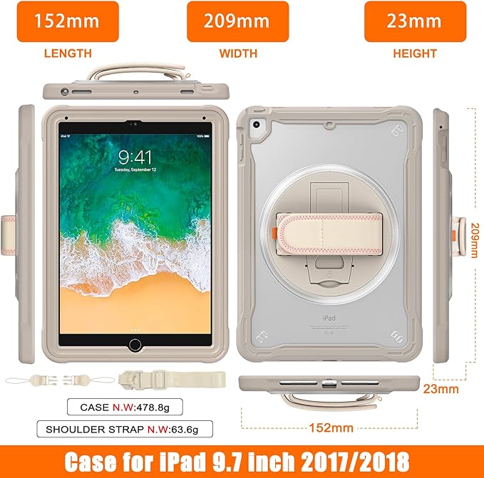 肩掛け iPad 5 iPad 6 Air2 Pro9.7 ケース 360度 回転 ハンドベルト 縦置き 横置き スタンド ショルダーストラップ付き 頑丈 iPad 第6 5世代 9.7インチタブレット カバーケース 斜め掛け ペン収納 耐衝撃 TPU+PC 半透明カバー(iPad5/iPad6/Air2/Pro9.7, カーキ)