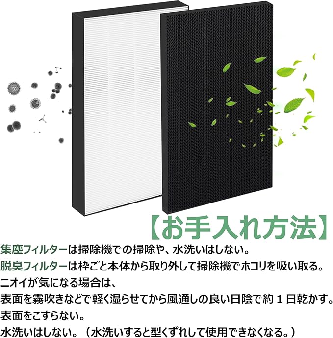 【お手入れ目安】集塵フィルターはお手入れ不可。脱臭フィルターはニオイや汚れが気になるとき、掃除機でホコリを吸い取る。