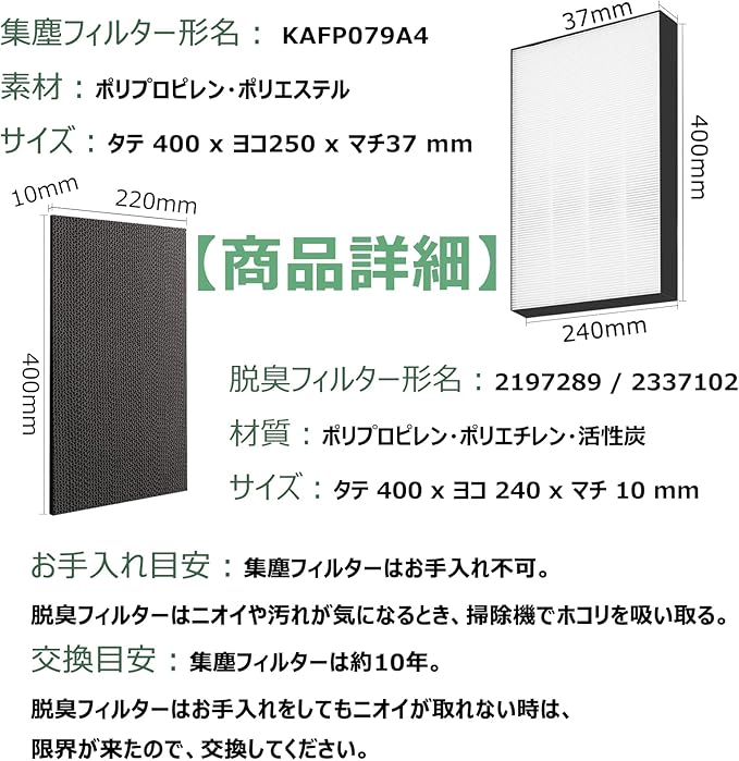 【機能】 KAFP079A4 集じんフィルター はPM2.5、花粉、アレル物質(ダニのふん・死がい)、カビ菌、ホコリ・チリ、タバコの煙(粒子)、ペットの毛などを捕集する。 2197289 / 2337102 脱臭フィルター はタバコの煙(ニオイ)、トイレのニオイ、生ゴミのニオイ、ペットのニオイなどの生活臭を吸着・分解する。