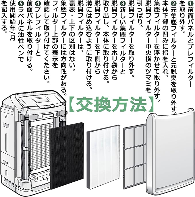 【交換目安】集塵フィルターは約10年。空気の汚れが多いところでご使用の場合は、交換時期が早くなる。効果がなくなってきたときは交換してください。脱臭フィルターはお手入れをしてもニオイが取れない時は、限界が来たので、交換してください。