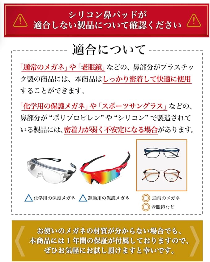 【注意事項】 「科化学用の保護メガネ」や「スポーツサングラス」などの鼻部分が”ポリプロピレン”や”シリコーン”で製造されている製品には、密着力が弱く不安定になる場合がございます。 お手持ちのメガネの材質確認のうえ、お買い求めください。