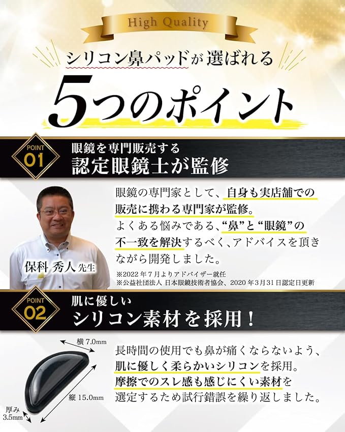 【認定眼鏡士が監修】汗でずり落ちてイライラする、鼻の高さと 眼鏡 の高さが合っていない、 メガネ 跡 が気になる、そんなお声から累計20万人以上の”目”に携わってきた専門家の監修の元、フィット感、快適さを追求した 鼻パッド です。
