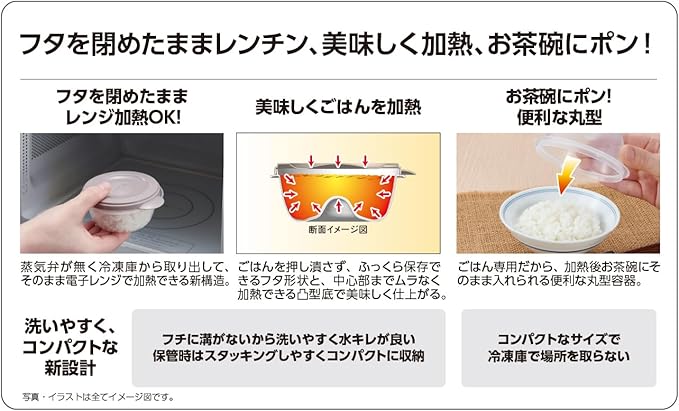 新構造ごはん専用冷凍保存容器、蒸気弁レスでフタをしたままレンジ加熱