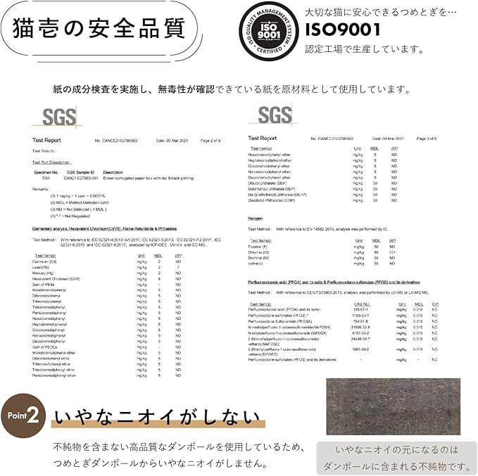 つめとぎ部分に使用しているダンボールは、原料の100%が紙。内10%はニュージーランド産原パルプ紙を使用。大切な猫ちゃんに使用するつめとぎなので、品質にはとことんこだわりました。原料の品質が良いため、とぎくずも出づらくなっています。