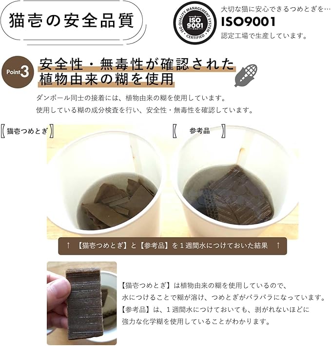 猫がつめとぎをした後、手や肉球をなめても心配がないよう、ダンボールを貼り合わせる際に使用している糊は、とうもろこしを主原料とした天然素材の糊を使用しています。