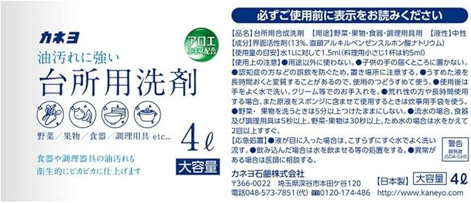 カネヨ石鹸の4L入りの台所用洗剤です。 泡立ちがよく、ベトベトした油汚れも洗い落とします。 使用後につぶせる容器です。 野菜・果物を洗うときは5分以上つけたままにしない。 流水の場合、食器及び調理器具は5秒以上、野菜・果物は30秒以上、ため水の場合は水をかえて2回以上すすぐ。
